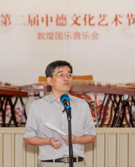 中华人民共和国驻德意志联邦共和国使馆领事侨务处周安平参赞致辞,从敦煌的历史、文化、艺术等角度出发,阐述了中华民族音乐的意义。