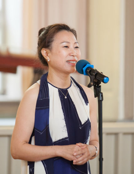 向梅老师则讲述了此次艺术节的意向与成果,意欲在柏林搭建一个传承和弘扬民族乐器和民族音乐的平台,并代表上海民族乐器一厂捐赠了一台“敦煌牌”的“鸣琴观梅” 系列定制古筝给柏林华德中文学校,期待海外热爱祖国的炎黄子孙,听国乐,奏国乐,让国乐响彻世界,让艺术节总策划、秘书长向梅老师致辞中国的文化造福人类。
