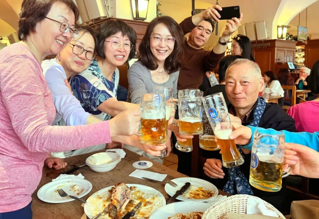 我们订台早,两个月前就早早地预定下了,所以占据了C位。面对舞台,大小号、黑管、吉他、手风琴,巴伐利亚服装,巴伐利亚音乐,肘子、香肠、大杯的啤酒,饮食和音乐这么紧密地融在了一起,强化了音乐对生活的直接感受。
