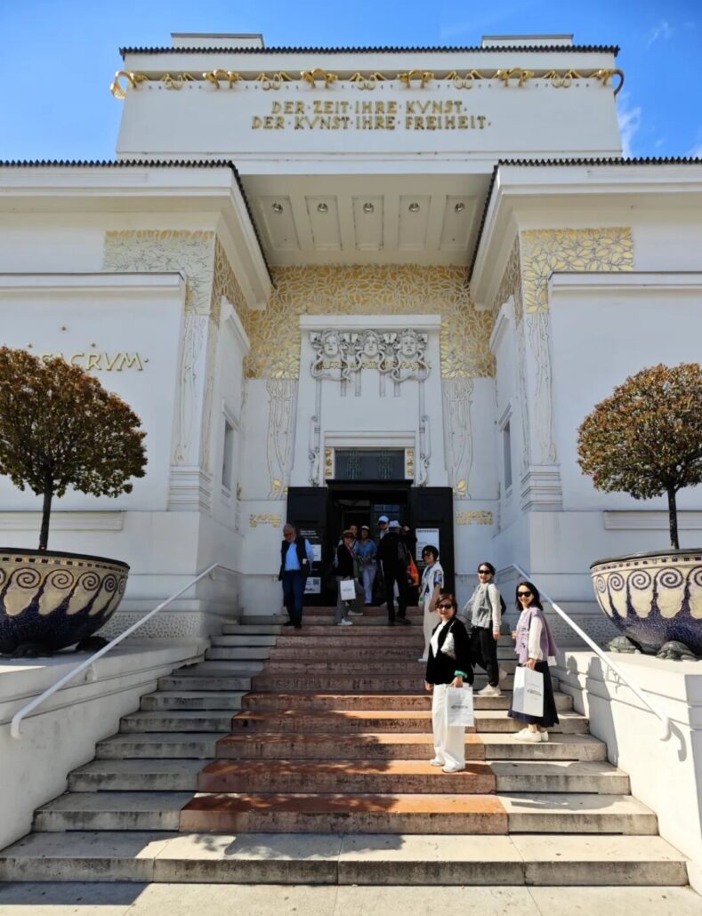 陈立老师携一众人等进了老远就能看见一个金球的分离派会馆。这个会馆在现代艺术史上占有独特的地位,是将当代艺术与建筑融和一体的典范,如今也成为大胆尝试青年艺术的重要论坛。来这里主要是看克里姆特的贝多芬饰带墙长卷壁画。