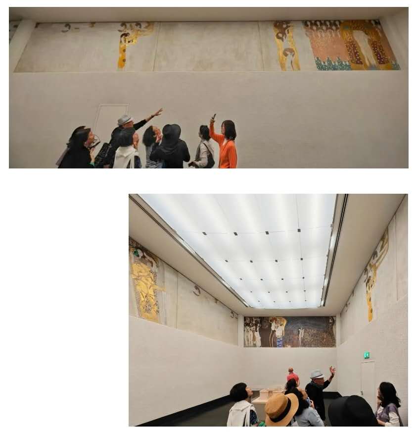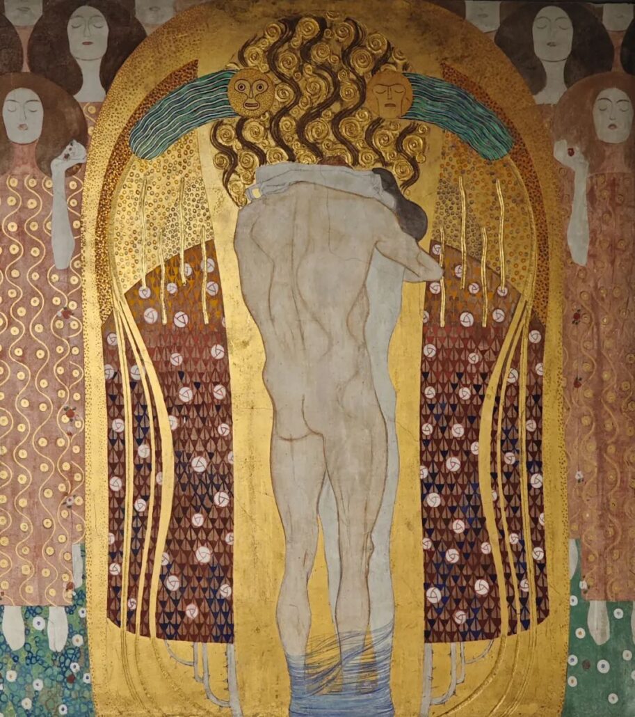绘画内容或因贝多芬第九交响曲而发,以男女“原罪”起,以“世界之吻”终,人类邪恶、世间苦难,无不囊括其中,从而面对未来,向往幸福。旁边有耳机,播放着贝九。绘画而音乐,音乐而绘画,往复循环,效果迭起。无愧为维也纳青年风格的巅峰之作。