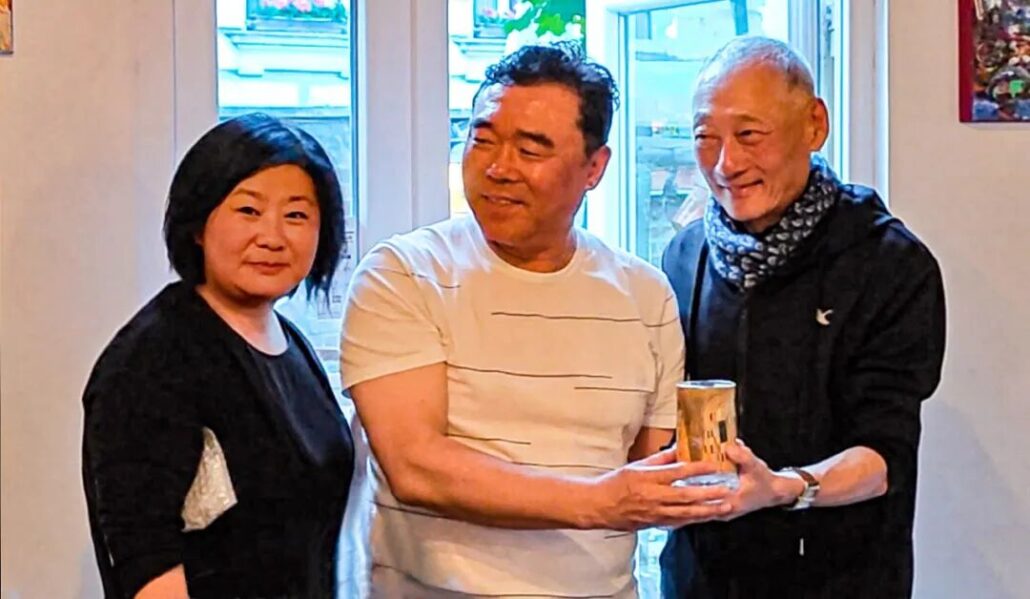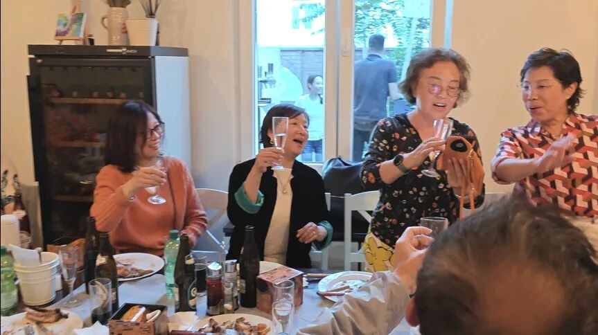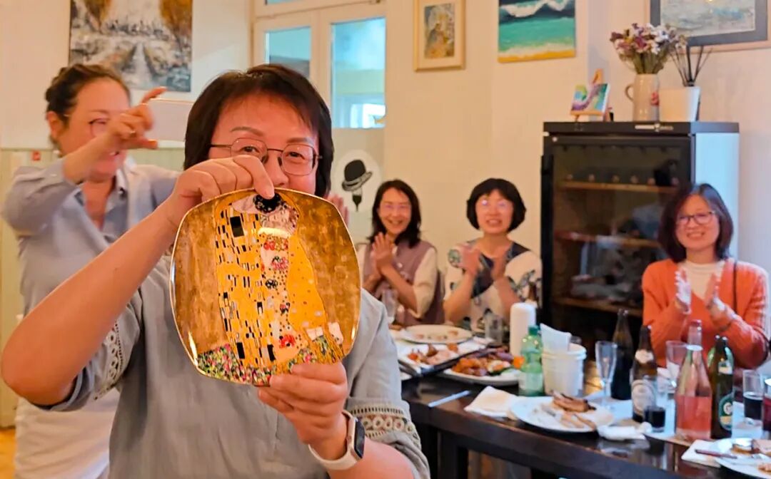 组织者送上贺礼:粉红香槟和克里姆特画盘《吻》。寿星激动地与梁巍老师拥抱。