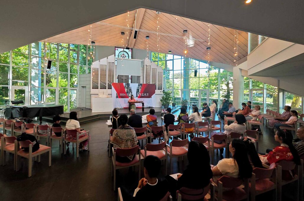 8月13日,来自中国、东南亚和欧洲的琴友和古琴学子在万湖浸礼宗教堂举行了比赛。中德观众莅临旁听。